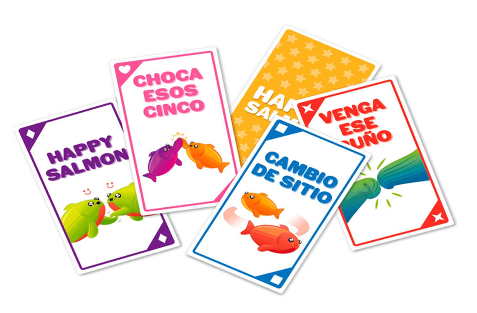 Happy Salmon es un juego caótico, rapidísimo y sin turnos, donde el primer jugador que se quede sin cartas, será el ganador de la partida.